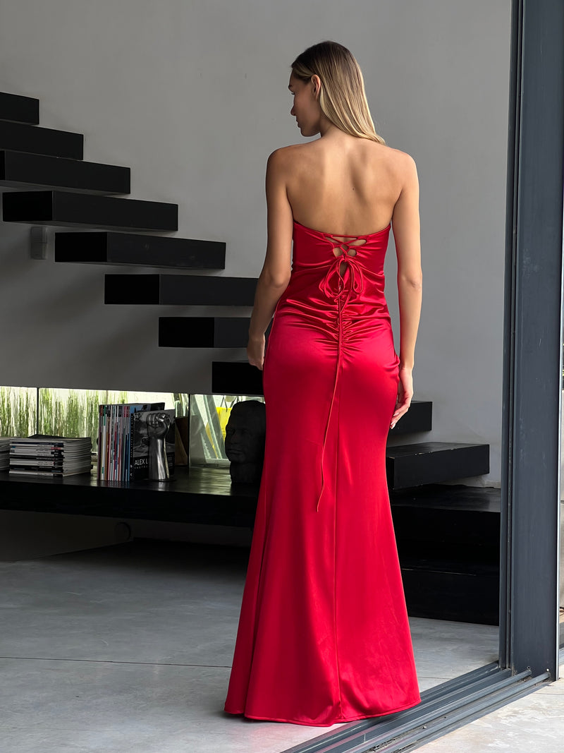 השמלה בגזרת סטרפלס עם כיווצים לפנים ושסע